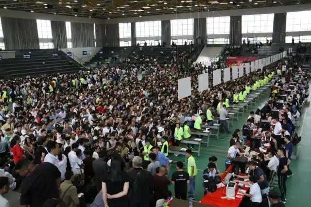 体育馆里人头攒动,录检、收费、注册各项工作有条不紊的进行着,为迎接新的生活做准备。左侧为24个新生检录窗口,3个一卡通办理窗口;右侧25个缴费窗口,现金、刷卡、为分流新生排队的拥挤,还提供了支付宝、微信等缴费方式,一应俱全的方式,大大减少了新生排队时间。