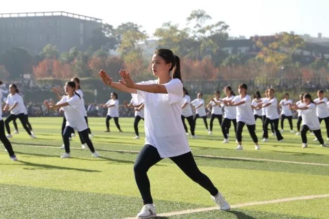 随着哨声的一声令下,表演太极拳的同学们威风凛凛地跑进了会场,整个绿茵场瞬间多了一股威严的气势。他们像是握着一个无形的球,在风中变得轻柔,却又感觉蕴藏了无穷的力量。他们用自己的努力,为我们展现出了中华武术的博大精深,也展现出了云工商学子坚韧不拔的精神。