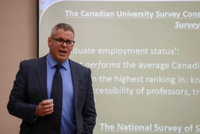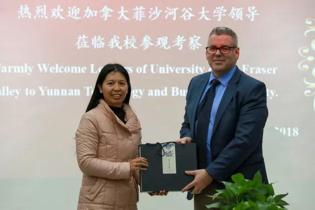 会议最后双方互赠礼品,作为加拿大菲沙河谷大学和本校友好往来的见证并合影留念。会议结束后,国际学院院长莫艳萍表示,这次交流促成了两个项目成果,一个是今年三月份,菲沙河谷大学国际教育学院将送10位学生来我校游学,这个项目的达成不仅能丰富校园文化,也能增强学校的国际化影响力。第二个项目是学历‘2加2’教育,该项目主要关注BBA专业和艺术学院的学生。这次会议对学校在欧美教育发展是一个好的开端。