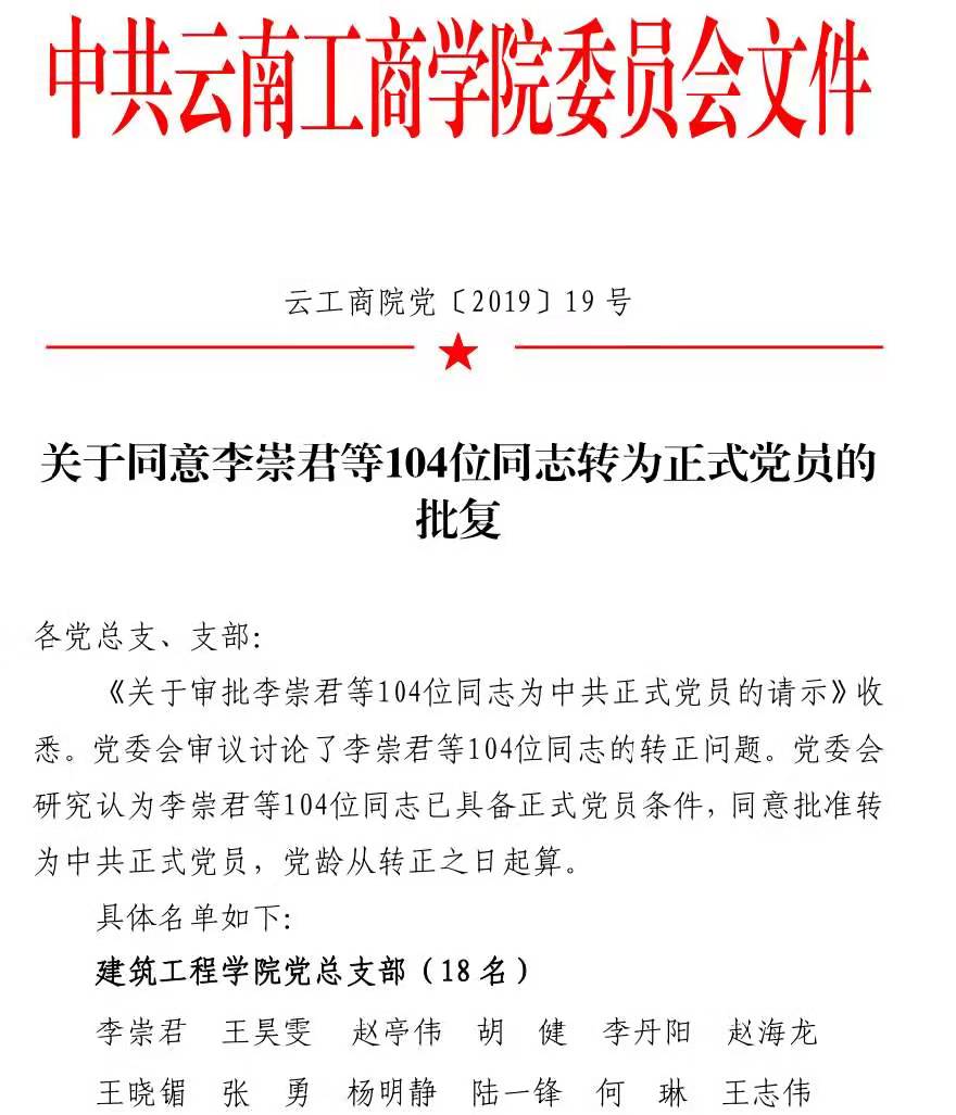 中共beat365正版唯一官方网站委员会关于同意李崇君等104位同志转为正式党员的批复