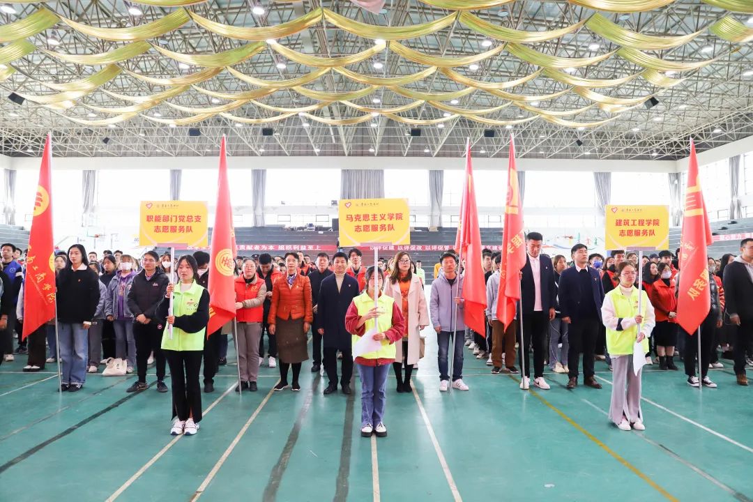 启动仪式上,党委书记李国琼、党委副书记佘达文、学生工作部部长张颖以及各党总支书记为学校11支志愿服务队授旗;随后,张颖带领在场师生志愿者宣读志愿者誓词,“我愿意成为一名光荣的青年志愿者。我承诺:尽己所能,不计报酬,帮助他人,服务社会。践行志愿精神,传播先进文化,为建设团结互助、平等友爱、共同前进的美好社会贡献力量。”志愿者的誓言在会场铿锵有力,久久回荡。