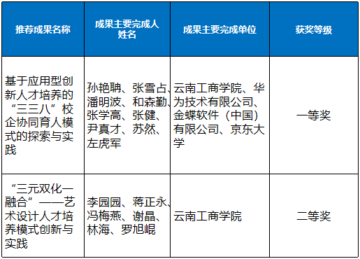 近日,《云南省教育厅、云南省人力资源和社会保障厅关于开展云南省教学成果奖评选表彰工作的通知》中对云南省2022年教学成果奖(高等教育)拟获奖名单进行了公示,我校《基于应用型创新人才培养的“三三八”校企协同育人模式的探索与实践》《“三元双化一融合”——艺术设计人才培养模式创新与实践》两项成果分别获得一等奖和二等奖。