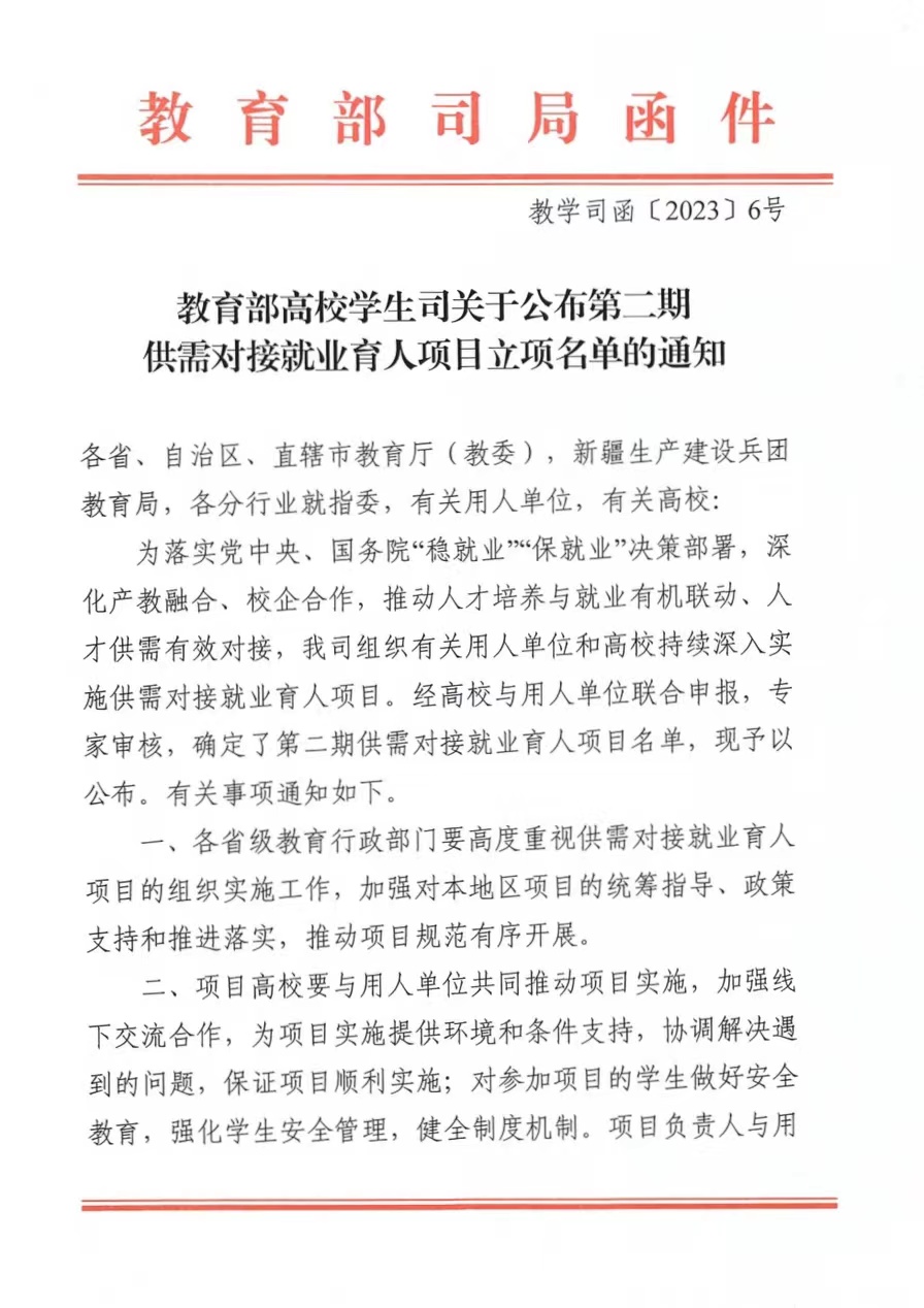 近日,教育部高校学生司发布《关于公布第二期供需对接就业育人项目立项名单的通知》,beat365正版唯一官方网站8个定向人才培养培训项目,10个就业实习基地项目,8个人力资源提升项目,共26个项目入选!