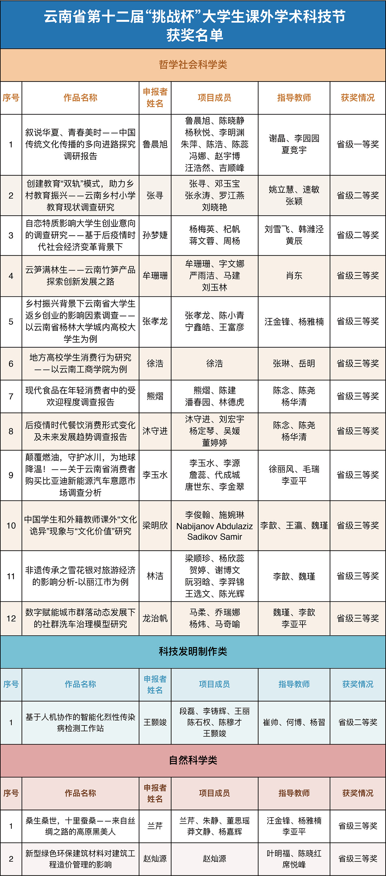 云南省“挑战杯”赛事自2001年举办以来,已经成为我省学生参与课外学术科技创新实践、促进不同学科间交流、培养学生创新意识的重要载体。本届大赛共分为自然科学类、哲学社会科学类、科技发明制作类三个类别,涵盖了高校开设的各学科门类。