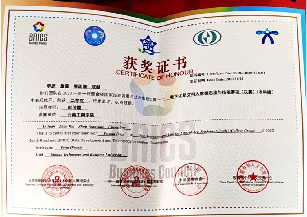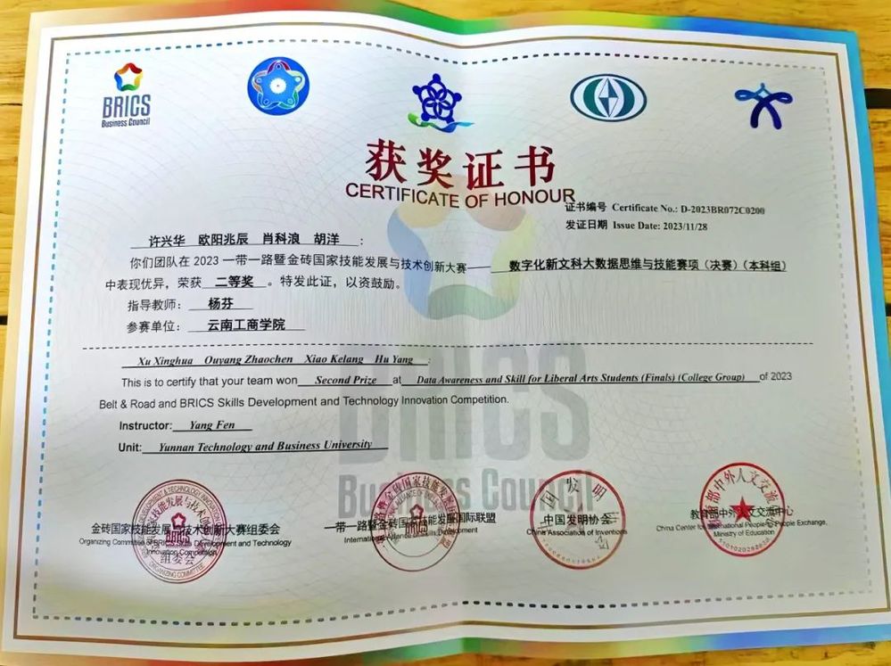 近日,beat365正版唯一官方网站经济与管理学院师生在2023第七届一带一路暨金砖国家技能发展与技术创新大赛——数字化新文科大数据思维与技能竞赛国内总决赛中斩获多个奖项,其中,学生组本科赛道获得国赛二等奖2项,教师组获得国赛二等奖1项、优秀奖1项。