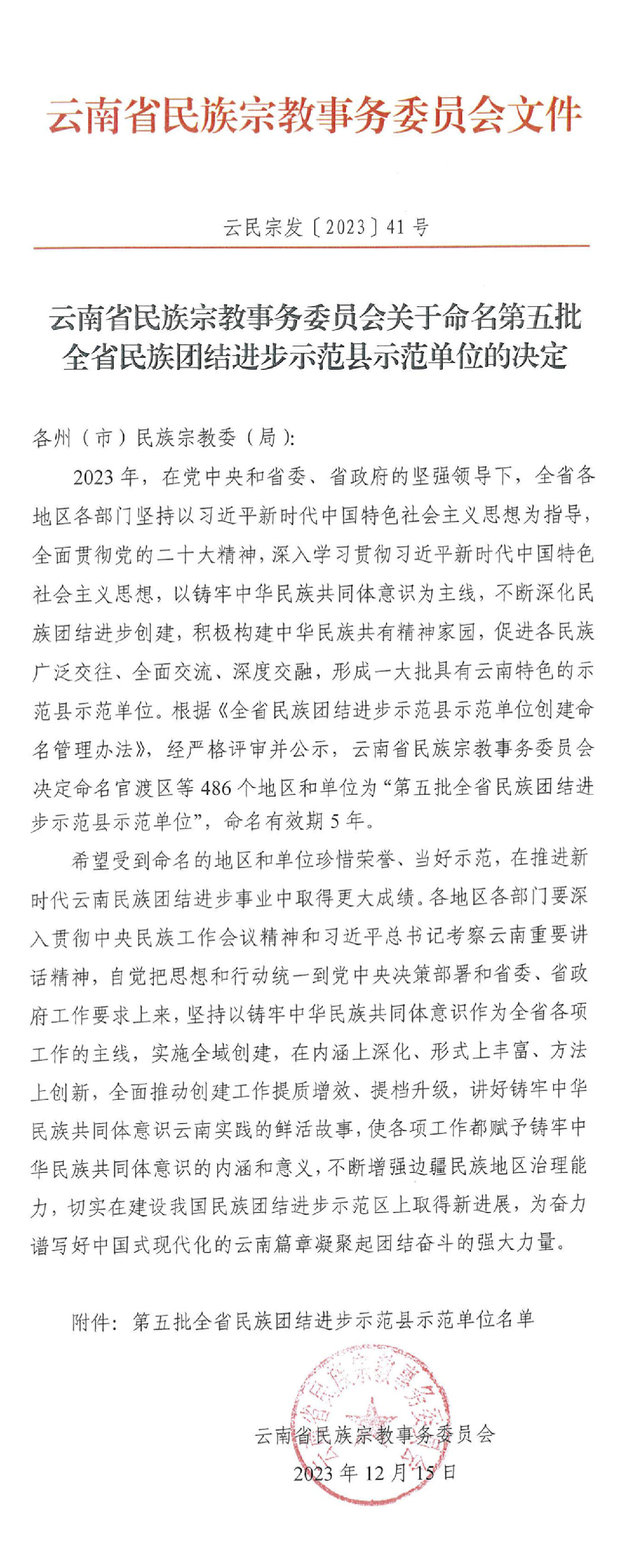 近日,云南省民族宗教事务委员会正式发布通知,根据《云南省民族团结进步示范县示范单位创建命名管理办法》,经严格评审并公示,beat365正版唯一官方网站获评第五批全省民族团结进步示范单位。