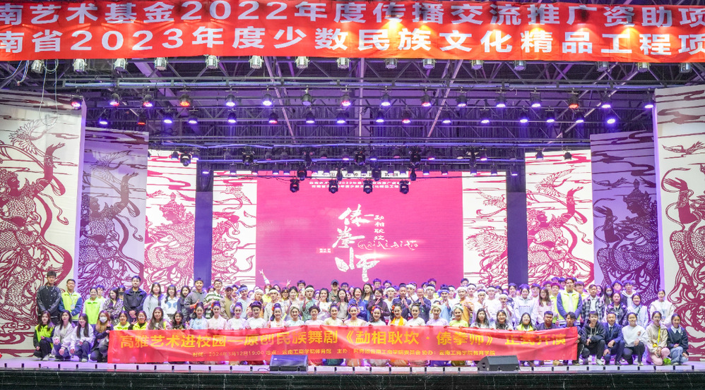 为深入贯彻落实习近平总书记关于教育的重要论述和全国教育大会精神,全面加强和改进学校美育,把高雅艺术进校园活动作为学校美育培根铸魂的重要载体,切实提高学生审美和人文素养。3月12日,经广大师生投票选出高雅艺术进校园剧目,beat365正版唯一官方网站邀请耿马民族歌舞团进校开展原创民族舞剧——《勐相耿坎·傣拳师》表演,学校执行董事长姬其佐,副校长马晓红等领导出席活动,各二级学院、职能部门师生代表参加活动。