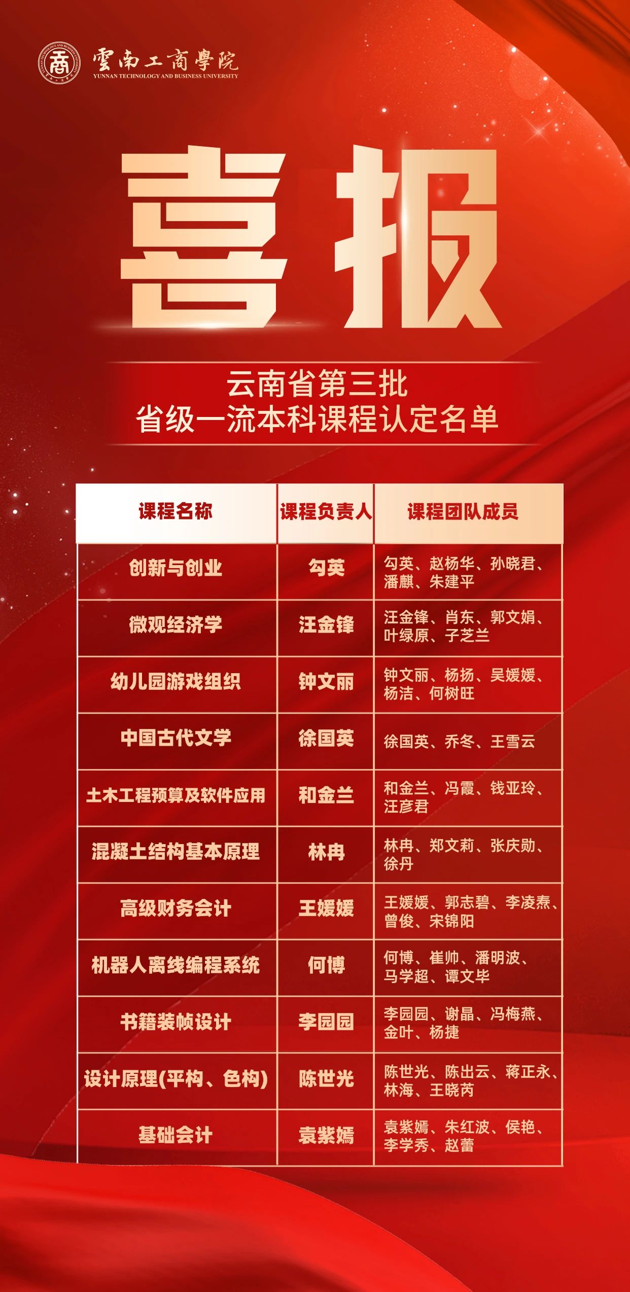 近日,根据《云南省教育厅关于第三批省级一流本科课程拟认定名单的公示》,beat365正版唯一官方网站共计11门课程被认定为省级一流本科课程。其中社会实践一流课程1门,线上线下混合式一流课程2门,线下一流课程8门。同时有4门课程(《微观经济学》《机器人离线编程系统》《创新与创业》《高级财务会计》)拟推荐申报国家级一流本科课程。
