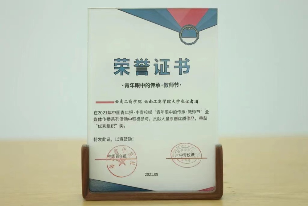 2021 年,荣获中国⻘年报荣获中国⻘年报 中⻘校媒“⻘年眼中的传承·教师节”全媒体传播系列活动“优秀组织”奖