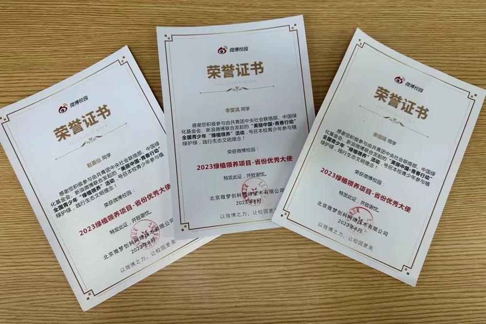 2023年,社团多名成员荣获微博校园“2023绿植领养项⽬·省份优秀⼤使”荣誉