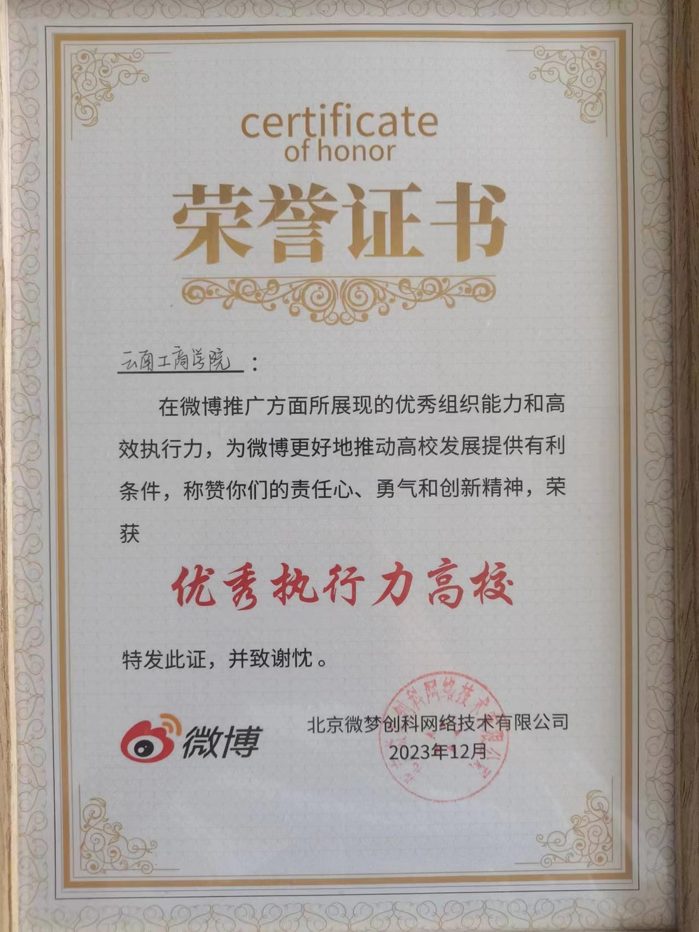 2023 年,荣获微博“优秀执⾏⼒⾼校”奖