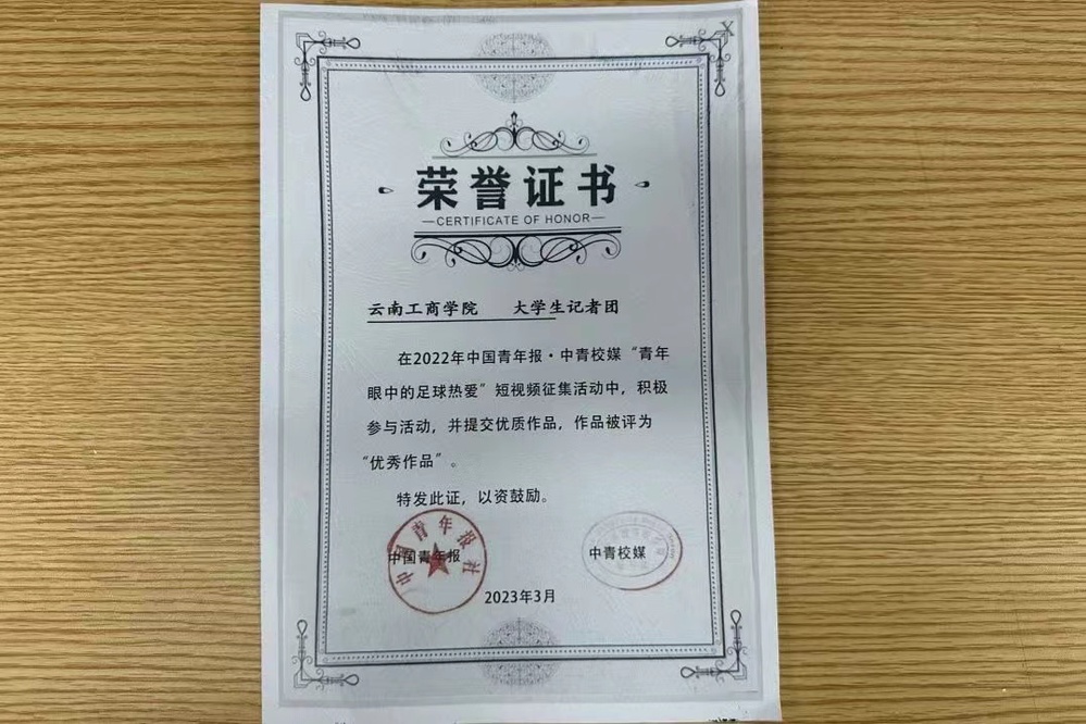 2022 年,荣获中国⻘年报·中⻘校媒“⻘年眼中的⾜球热爱”短视频征集活动“优秀作品”奖