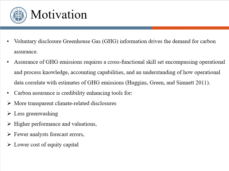 廖林副教授围绕鉴证的提供者、鉴证证据收集的程度以及准则等三个方面,进行了以“气候相关信息和碳信息的鉴证”为主题的报告。他指出,碳鉴证与财务关系十分紧密,碳信息的鉴证存在两组提供者,一组是会计师事务所,另一组是行业的顾问公司;针对文化对于碳鉴证的影响,他也提出了观点,他提出,金融是现代经济的核心,绿色金融是推动绿色发展的重要力量,应该从推动绿色金融与能源强国融合建设、与产业升级融合并进、与共同富裕融合共处、与绿色消费融合升级四个方面发力,协同推进降碳减污扩绿和增长。