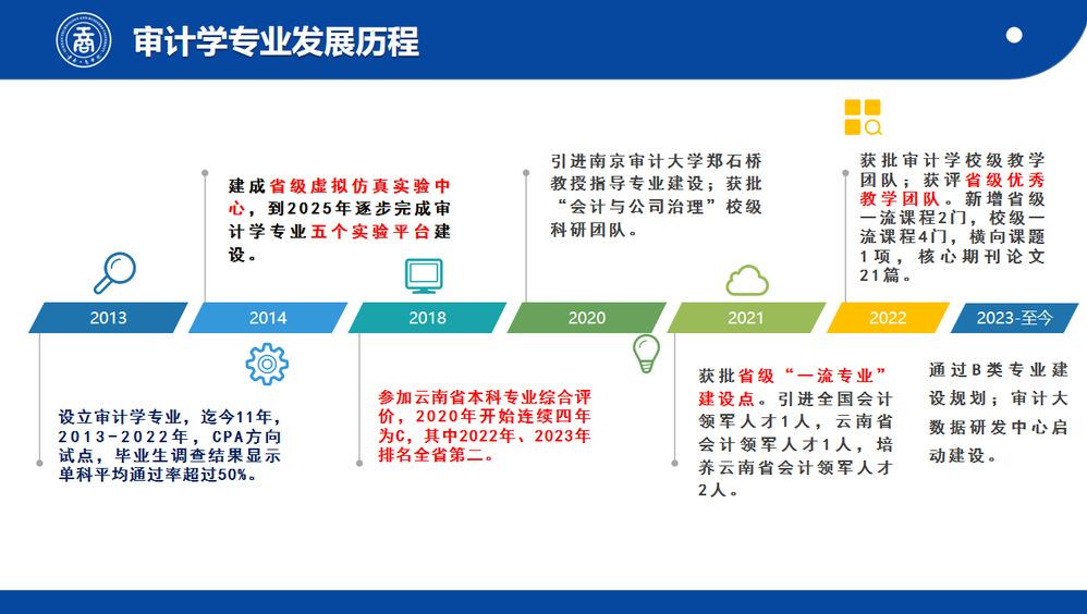 专业以智能审计大数据平台、智能会计大数据平台、财务共享中心、跨专业综合模拟仿真实验教学中心等数字化平台提高教学科研和社会服务能力,持续推动教育教学内容更新,以注册会计师审计为基础和主要发展方向,以智能审计技术应对数字经济挑战,跨学科发展培养学生的创新意识和创新能力,助力学生实现高质量就业。