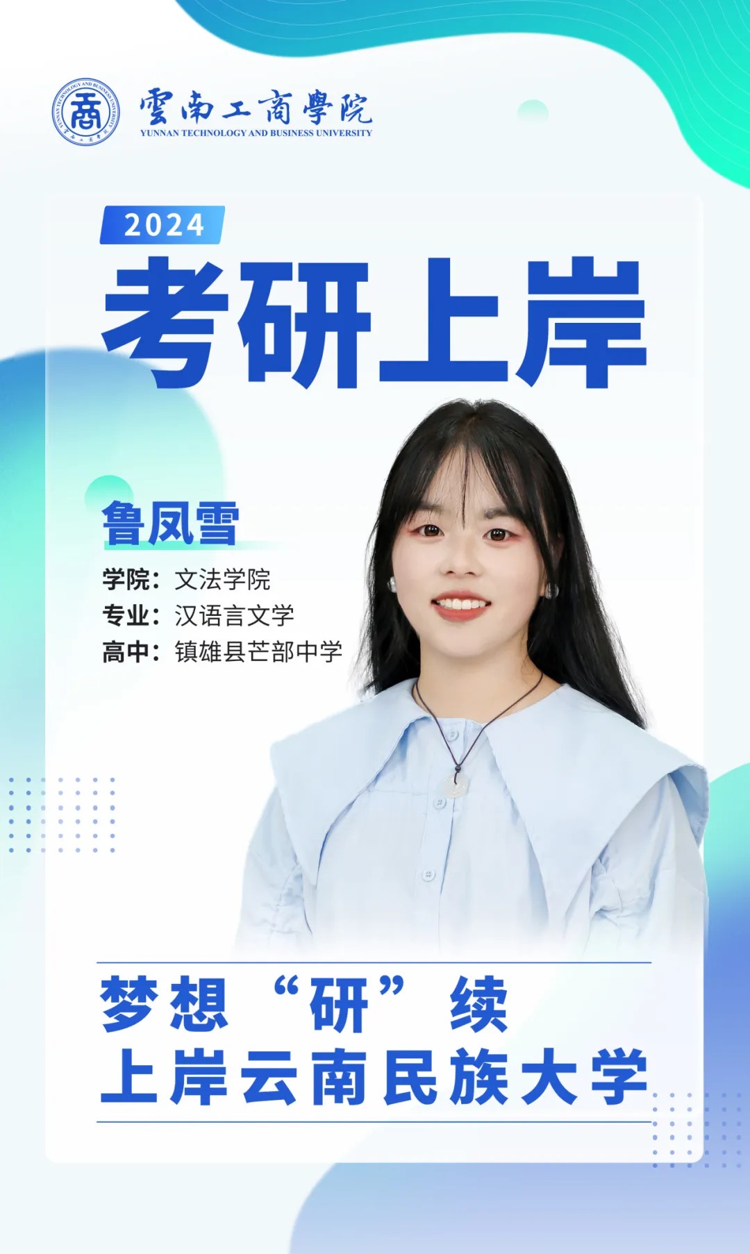 大家好,我是鲁凤雪。高中毕业于镇雄县芒部中学,目前通过考研上岸云南民族大学,专业是对外汉语教学。大学期间曾连续两次荣获国家励志奖学金,此外,还获得筑梦奖学金,云南省三好学生称号、优秀志愿者称号等荣誉称号。