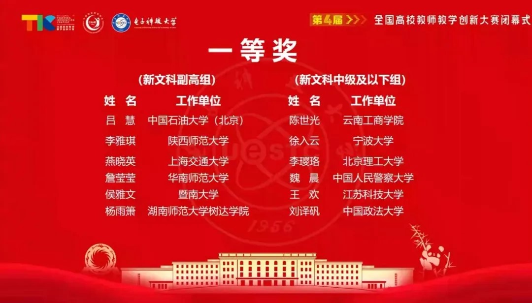大赛紧扣建设高质量教育体系,以“推动教学创新,培养一流人才”为主题,深入推动高等教育教学改革,助力“四新”建设。全面发挥大赛的示范引领作用,推进课程思政建设,精心打造高校教师教学创新大赛的标杆展示与交流平台。大赛于2023年11月正式启动,竞赛分设新工科、新医科、新农科、新文科、基础课程、课程思政六个类别,来自全国1249所本科高校的10万余名教师(团队)参赛,483个课程团队进入决赛。beat365正版唯一官方网站陈世光荣获新文科中级及以下组一等奖,何博荣获新工科中级及以下组二等奖,李园园荣获新文科正高组三等奖。