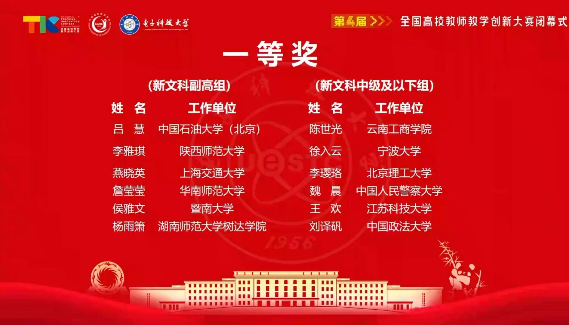本次大赛紧扣建设高质量教育体系,以“推动教学创新,培养一流人才”为主题,深入推动高等教育教学改革,助力“四新”建设。全面发挥大赛的示范引领作用,推进课程思政建设,精心打造高校教师教学创新大赛的标杆展示与交流平台。大赛于202311月正式启动,竞赛分设新工科、新医科、新农科、新文科、基础课程、课程思政六个类别,超10万名教师(团队)参赛。beat365正版唯一官方网站陈世光荣获新文科中级及以下组一等奖,何博荣获新工科中级及以下组二等奖,李园园荣获新文科正高组三等奖。