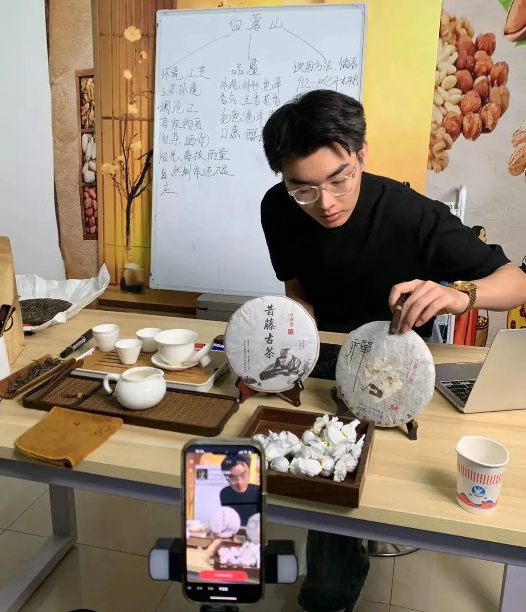 直播中,建筑与设计学院学生李柄言从茶叶采摘、制作到品鉴,为消费者详细讲解了白莺山茶园基地的茶文化和茶产品。“这次直播意义非凡,不仅让我更加了解家乡的茶叶,还让更多茶农直观感受到网络直播带货的魅力。”两场直播观看人数超6000人次,最高在线人数544人,获得点赞11万余次,共销售助农产品87件,价值超万元。同时,李柄言还为村民提供了直播技巧、产品展示和营销方法的培训,手把手教村民开设直播账号。参加培训的村民说:“我们一直想直播,但是不会做,培训之后会一点点做起来。”