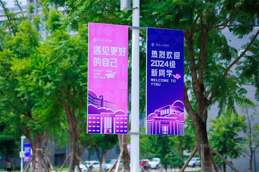 校园沐浴在热烈浪漫的粉蓝色迎新氛围中。道旗帜上的考研上岸榜样、优秀学子、优秀教师榜样等激励新生与良师益友同行。各类洋溢着青春气息的展板、条幅、玫瑰花瀑布、打卡点等吸引了同学们的目光,大家纷纷拍照留念。同时,迎新日全天还有社团才艺展示、云南特色“打跳”等活动,让新生们感受到了校园文化的无限可能。
