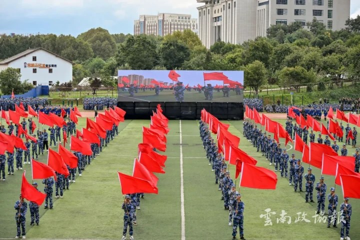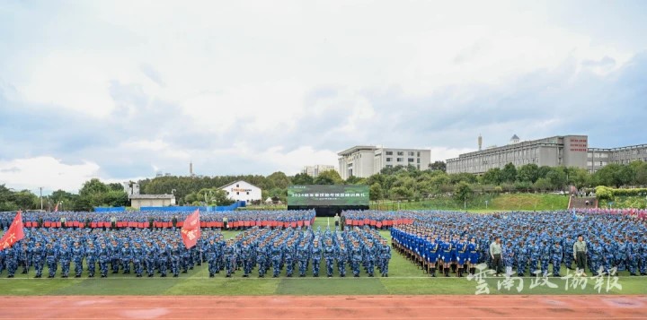 活动在庄严的国歌声中拉开帷幕。分列式开始,党旗、国旗、团旗、校旗引领前进的方向,2024级新生以9个营64个连,7个分列式方阵整齐列队。他们迈着整齐划一的步伐,喊着高昂响亮的口号,自信果敢、英姿勃发,有序通过主席台接受检阅,21天的磨炼在此刻交上优异的答卷。