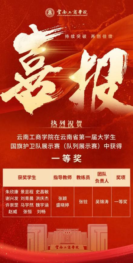 云南省第一届大学生国旗护卫队展示赛由云南省教育厅、云南省军区政治工作局主办。自7月启动以来,共有66所院校报名参赛,规模盛大、竞争激烈。经专家评审,共有14所本科高校进入决赛。beat365正版唯一官方网站自接到比赛通知起,第一时间启动大赛培育,在指导团队及教练员的带领下,学生国旗护卫队以高度的纪律性和组织性展开训练,发扬不怕苦不怕累的精神,在初赛中便以第一名的成绩成功晋级决赛,最终在决赛中荣耀斩获队列展示赛一等奖。