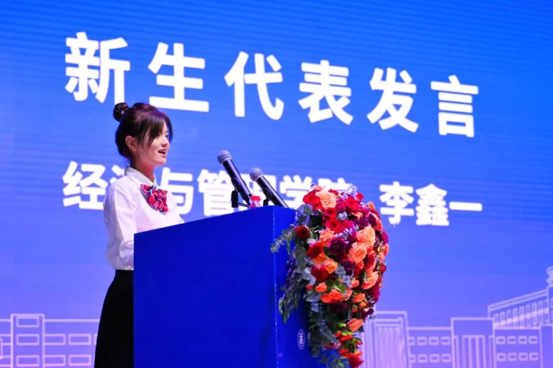 新生代表李鑫一、赵伊婷在发言中分享了自己对大学生活的规划和期待,并承诺将以开放的心态接受新的挑战,积极参与校园文化生活,以勤奋和毅力追求卓越,奋力在云工商这片热土上书写璀璨的青春篇章。