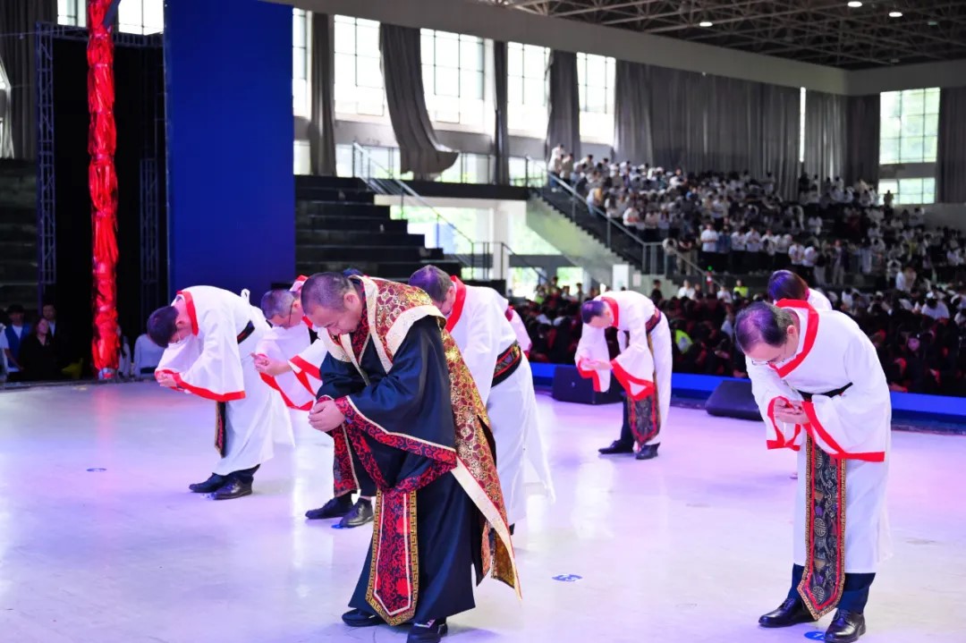 入学尊师礼在融合传统文化与现代教育的仪式中正式举行,学子们正衣冠,向孔子像敬献花篮,一拜自强不息,二拜厚德载物,三拜精忠报国,四拜孝亲尊师,五拜至亲父母。