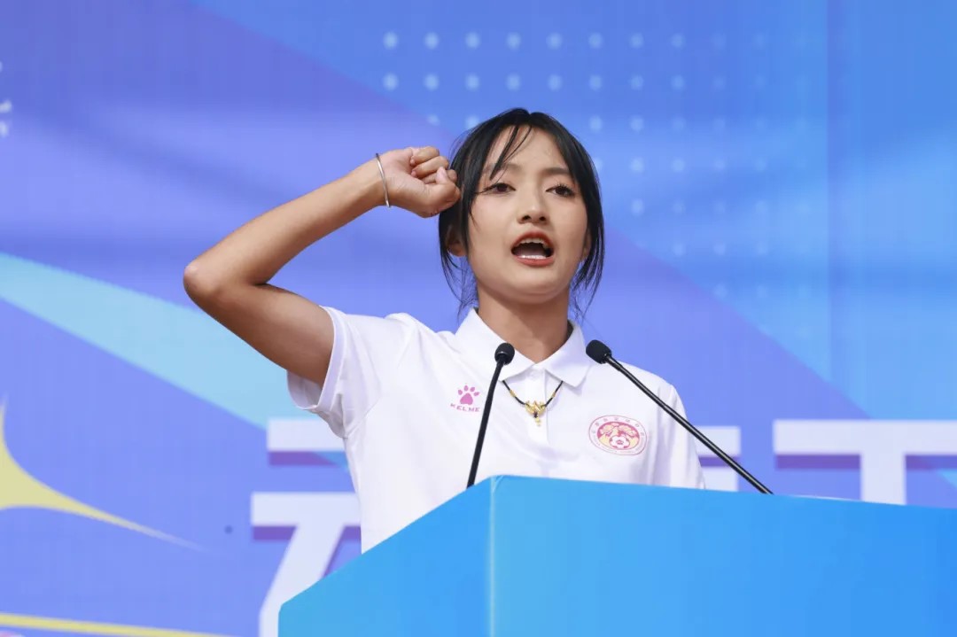 教育学院2021级【本科】体育教育3班的穆嘉同学代表全体运动员宣誓,表示将严格遵从比赛纪律和竞赛规则,尊重裁判、尊重对手,以饱满热情积极参加运动会,力争取得优异成绩。