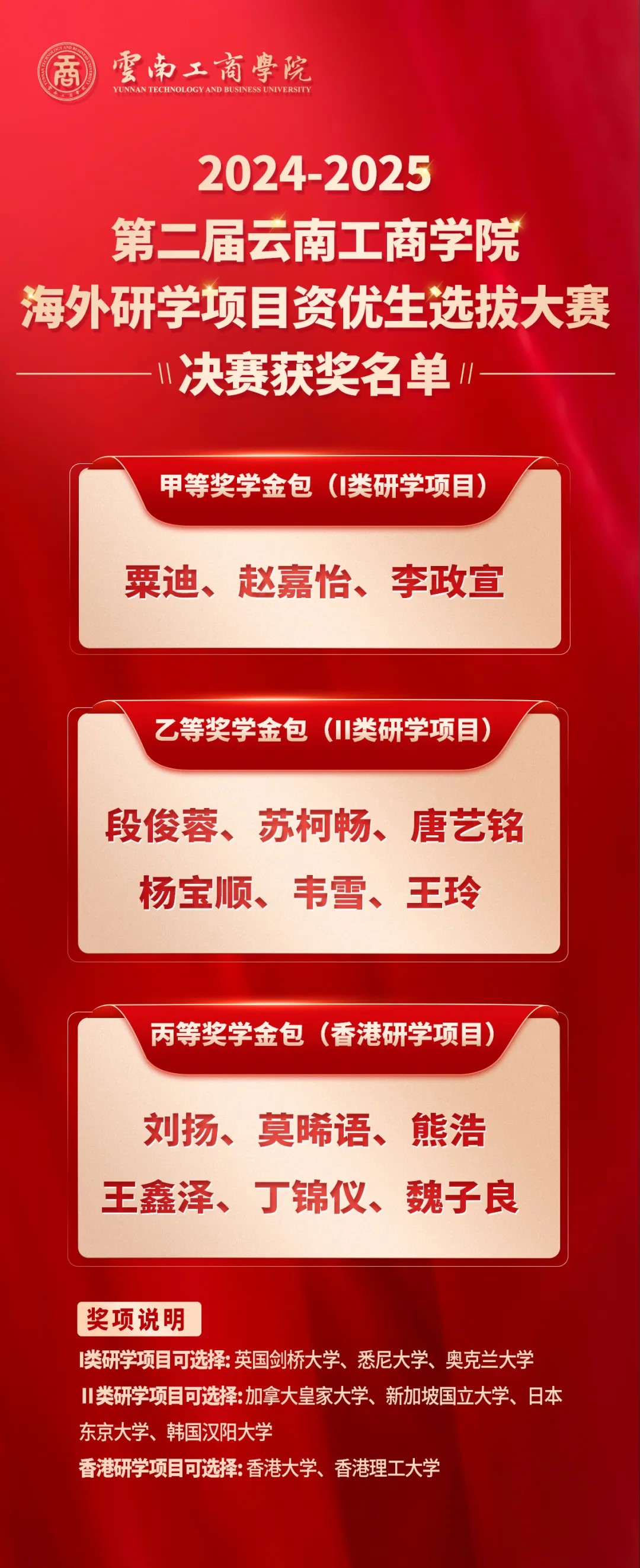 经过激烈的角逐,按照比赛规则,决赛成绩从高至低排名,共有15位选手分别获得甲、乙、丙等奖学金包,根据奖项类型,这些同学可以分别从英国剑桥大学、悉尼大学、奥克兰大学、加拿大皇家大学、新加坡国立大学、日本东京大学、香港大学、香港理工大学等世界名校中选择研学院校,公费开启国际研学,拓展国际视野。同时,其他进入决赛的选手也将有机会获得研学项目专项优秀奖学金奖励。