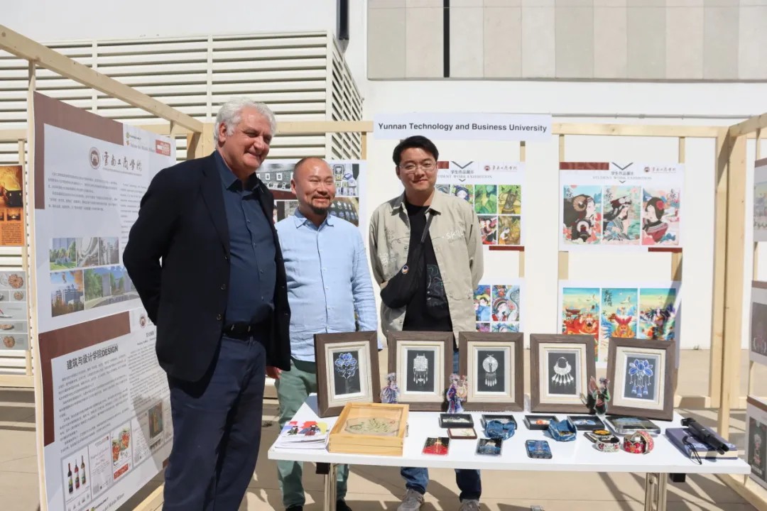 尤为引人瞩目的是学校建筑与设计学院教师谢晶教授独创的“翠羽银丝工艺” 系列作品。这一工艺大胆突破传统,巧妙融合了点翠、掐丝、景泰蓝、岩画等多种传统技艺,实现了创新性的转化与发展。目前,该工艺已成功获得1项国家发明专利、3项实用新型专利以及百余项版权登记。其学生团队基于此工艺开发的文创设计作品,不仅被东方航空公司选为国礼赠予外国政要,更在展览现场成为了国际关注的焦点,收获了广泛赞誉。借助这一平台,学校师生不仅向世界展示了云南民族文化的深厚底蕴,也为推动中国设计走向国际舞台贡献了更多智慧与创意。