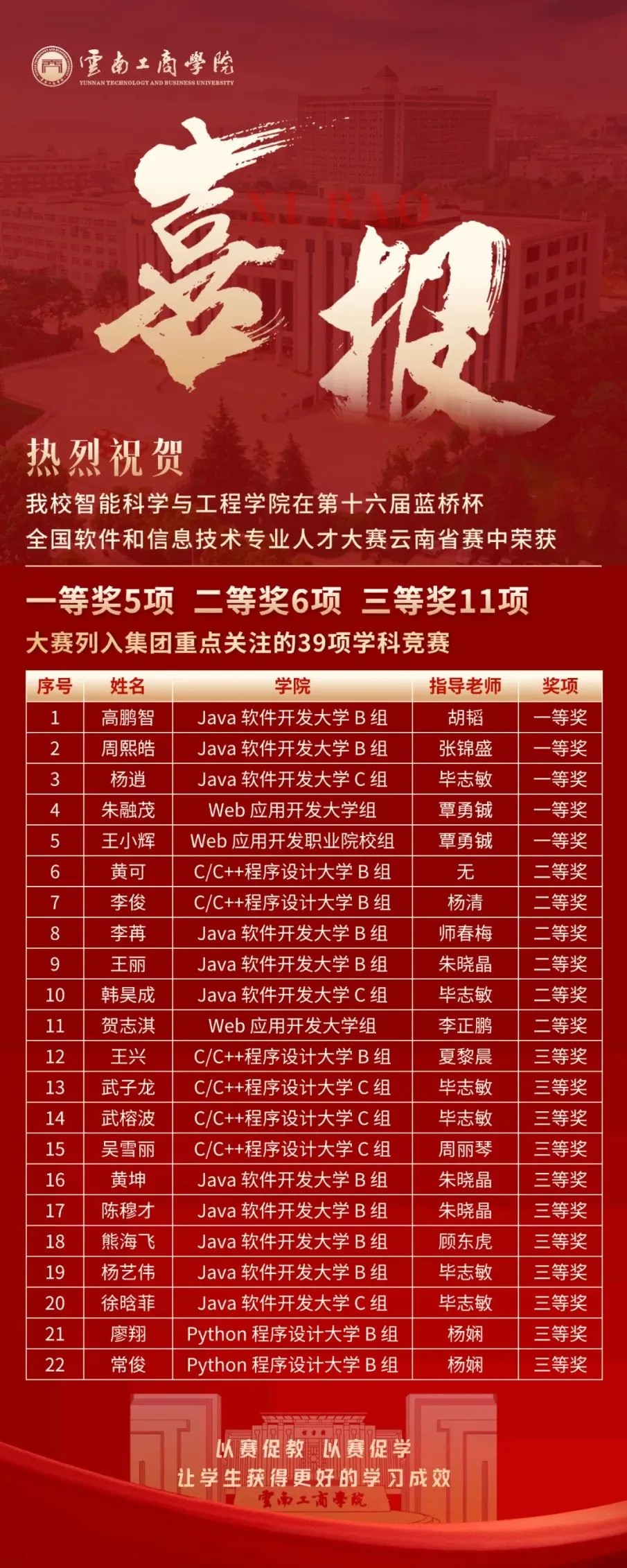 近日,beat365正版唯一官方网站在第十六届蓝桥杯全国软件和信息技术专业人才大赛省赛中,荣获省级一等奖5项、二等奖6项、三等奖11项。
