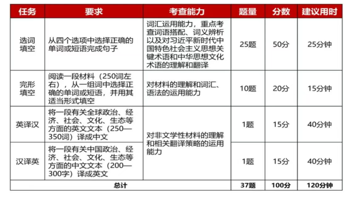 英语组题目类型、难度、测试系统均与2025“外研社·国才杯”“理解当代中国”全国大学生外语能力大赛英语组综合能力、笔译校赛要求一致,具体如下所示。