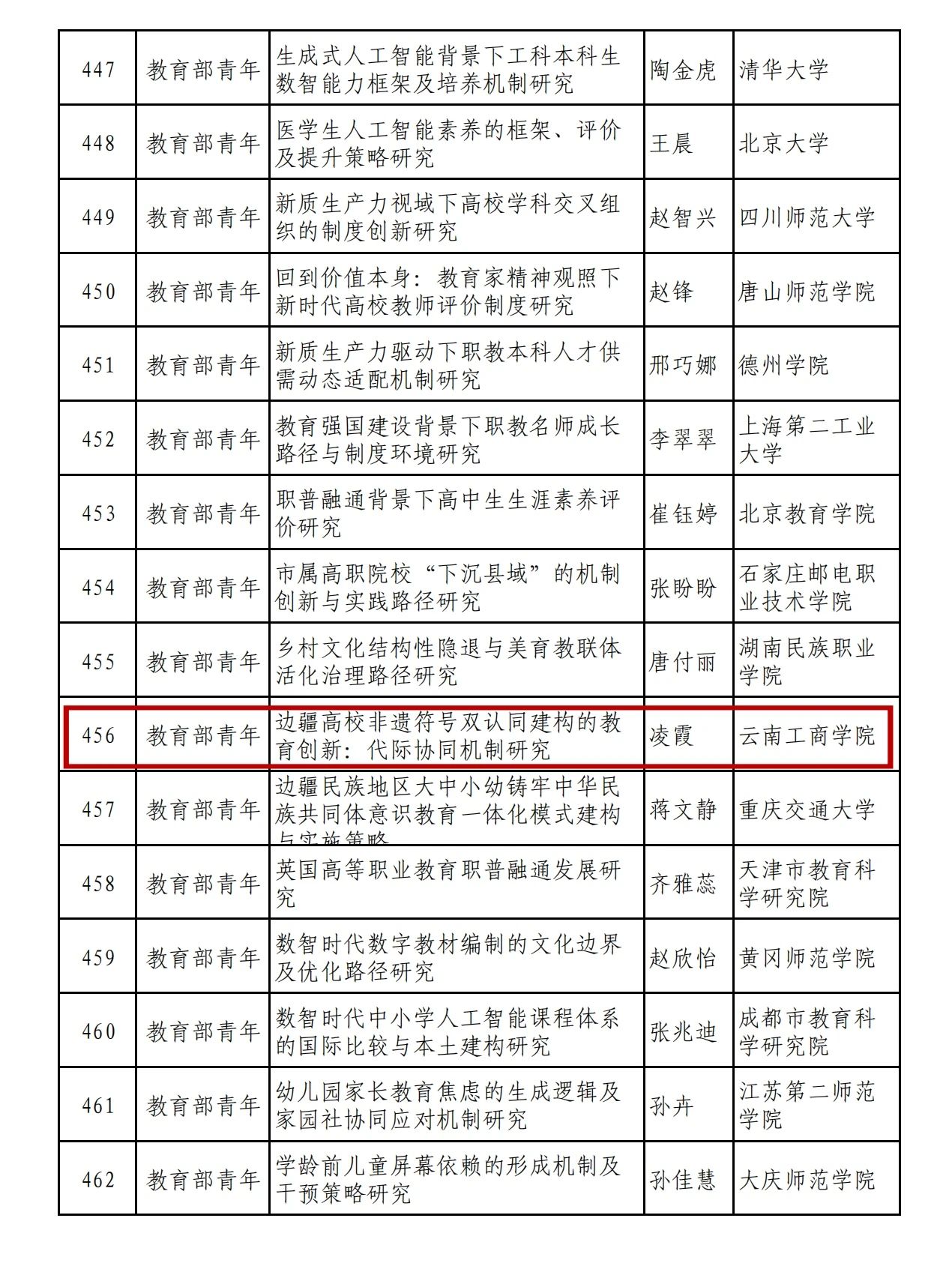 近日,全国教育科学规划领导小组办公室发布《2025年度全国教育科学规划拟立项名单公示》,学校文法学院教师凌霞主持申报的《边疆高校非遗符号双认同建构的教育创新:代际协同机制研究》成功入选全国教育科学规划教育部青年课题,beat365正版唯一官方网站也成为此次省内唯一入选的高校。