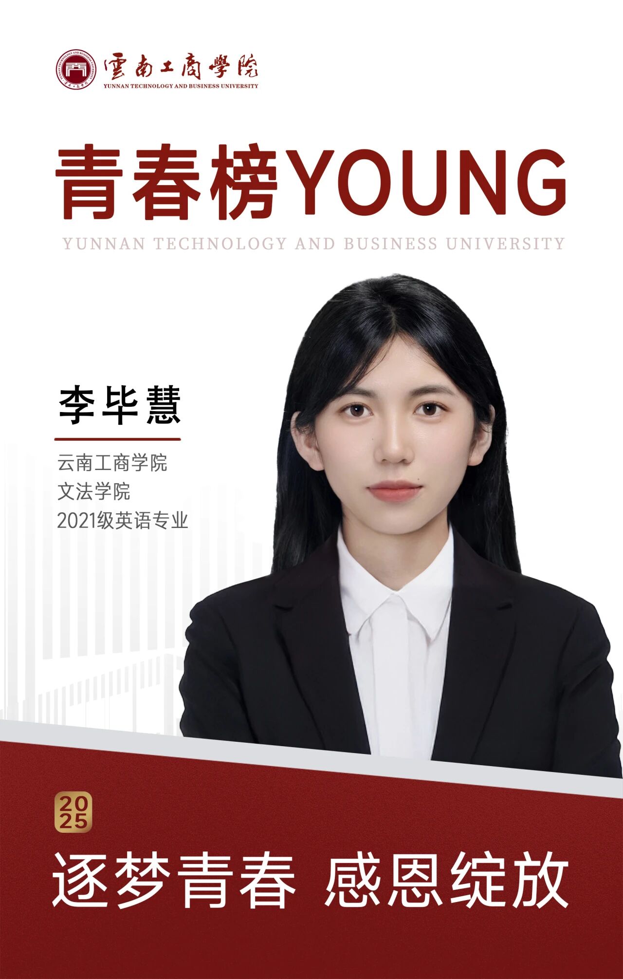 从受助者到服务者、传播者的角色转变,让我对“感恩”的理解愈发具体。它不再是抽象的概念,而是化为了每一次课堂的专注、每一次竞赛的拼搏、每一次为同学服务的尽职尽责。云工商为我提供了成长的沃土,而我,则在这片沃土中拼命汲取养分,期待有一天能够枝繁叶茂,为他人遮风挡雨。