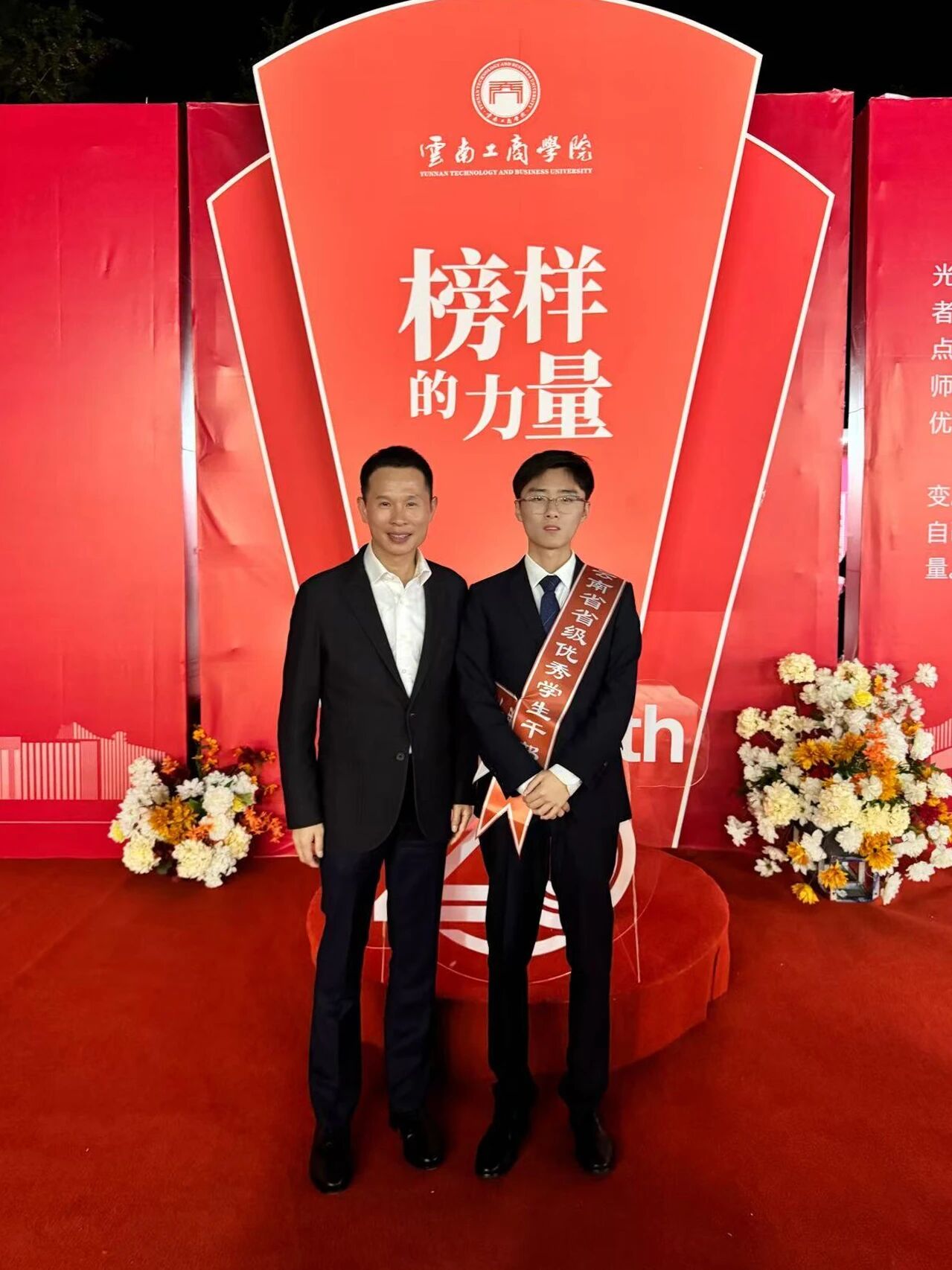 在优秀学生表彰大会上,赵健豪与执行校长李孝轩合影