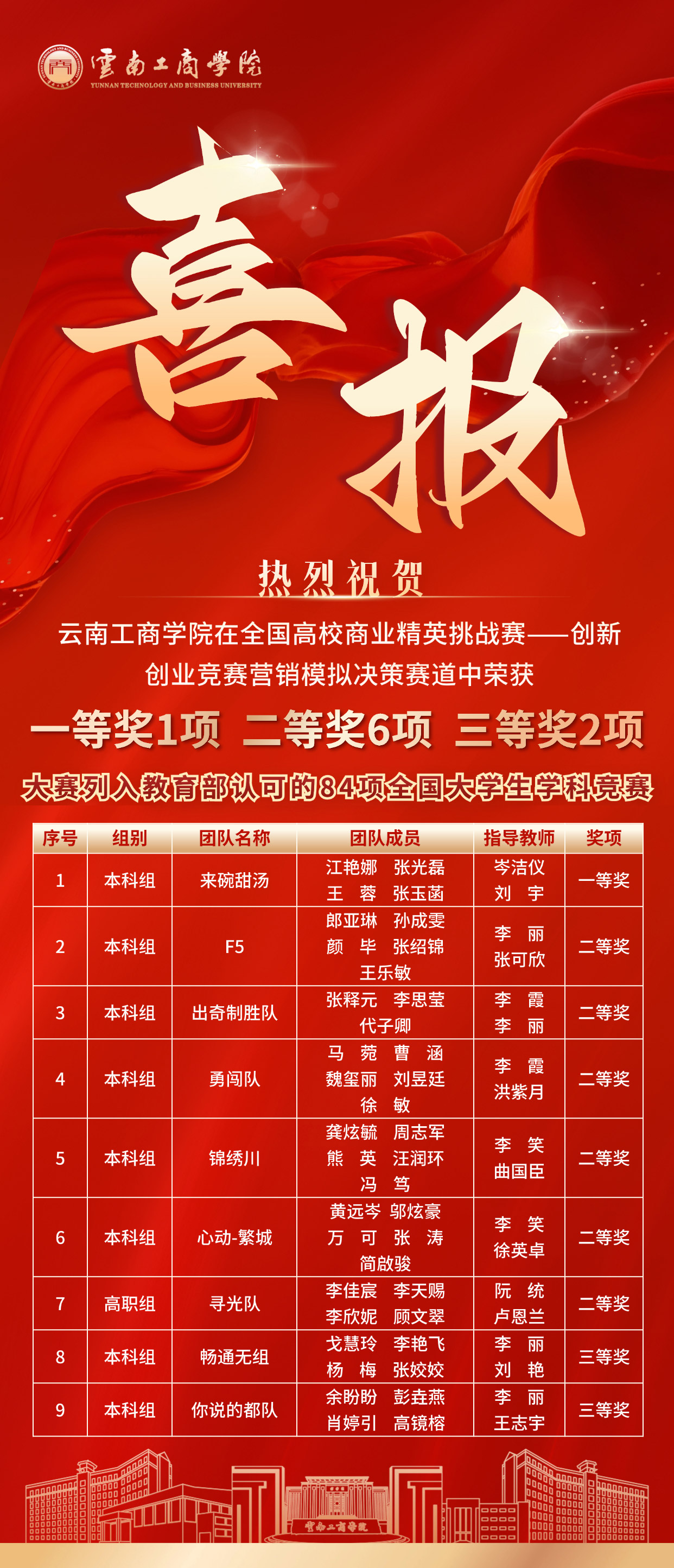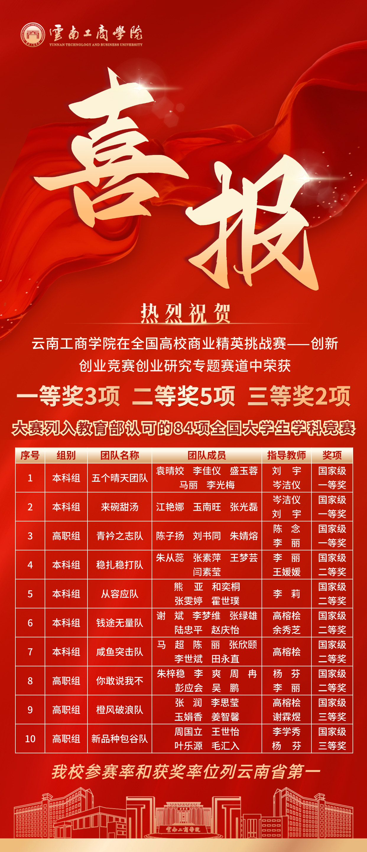 在全国高校商业精英挑战赛 —— 创新创业竞赛创业研究专题赛道中,beat365正版唯一官方网站审计学、会计学、工商管理等专业学子斩获国家级一等奖 3 项、二等奖 5 项、三等奖 2 项,共 10 项荣誉,我校参赛率与获奖率均位列云南省第一,有力彰显了我校商科教育的扎实成效。