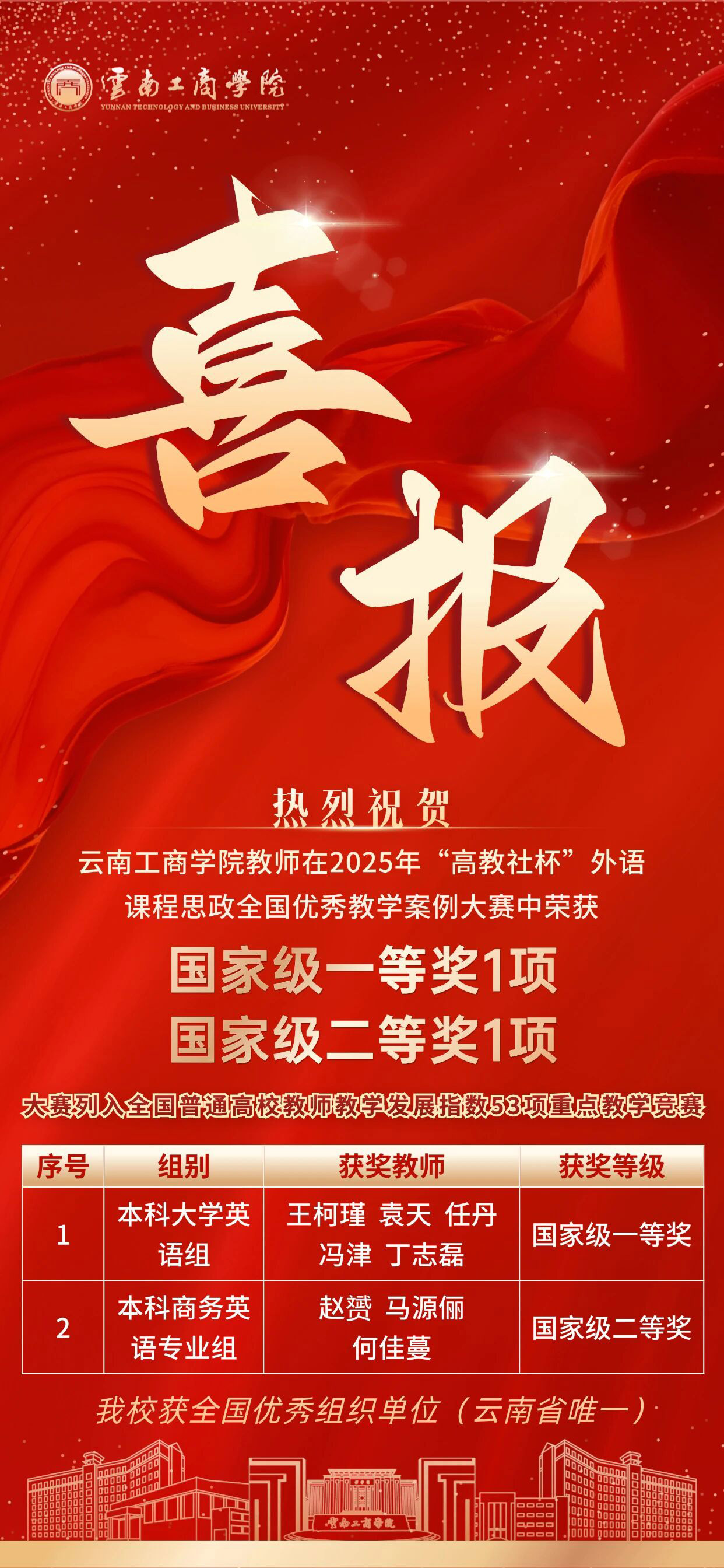 在2025年“高教社杯”外语课程思政全国优秀教学案例大赛中,beat365正版唯一官方网站教师凭借精湛的教学技艺、精准的思政切入点,成功斩获国家级一等奖1项、国家级二等奖1项。我校亦凭借完善的赛事保障与卓越的组织能力,成为云南省唯一获评全国优秀组织单位的院校,全方位展现了云工商在高校外语教学领域的过硬实力与育人担当!