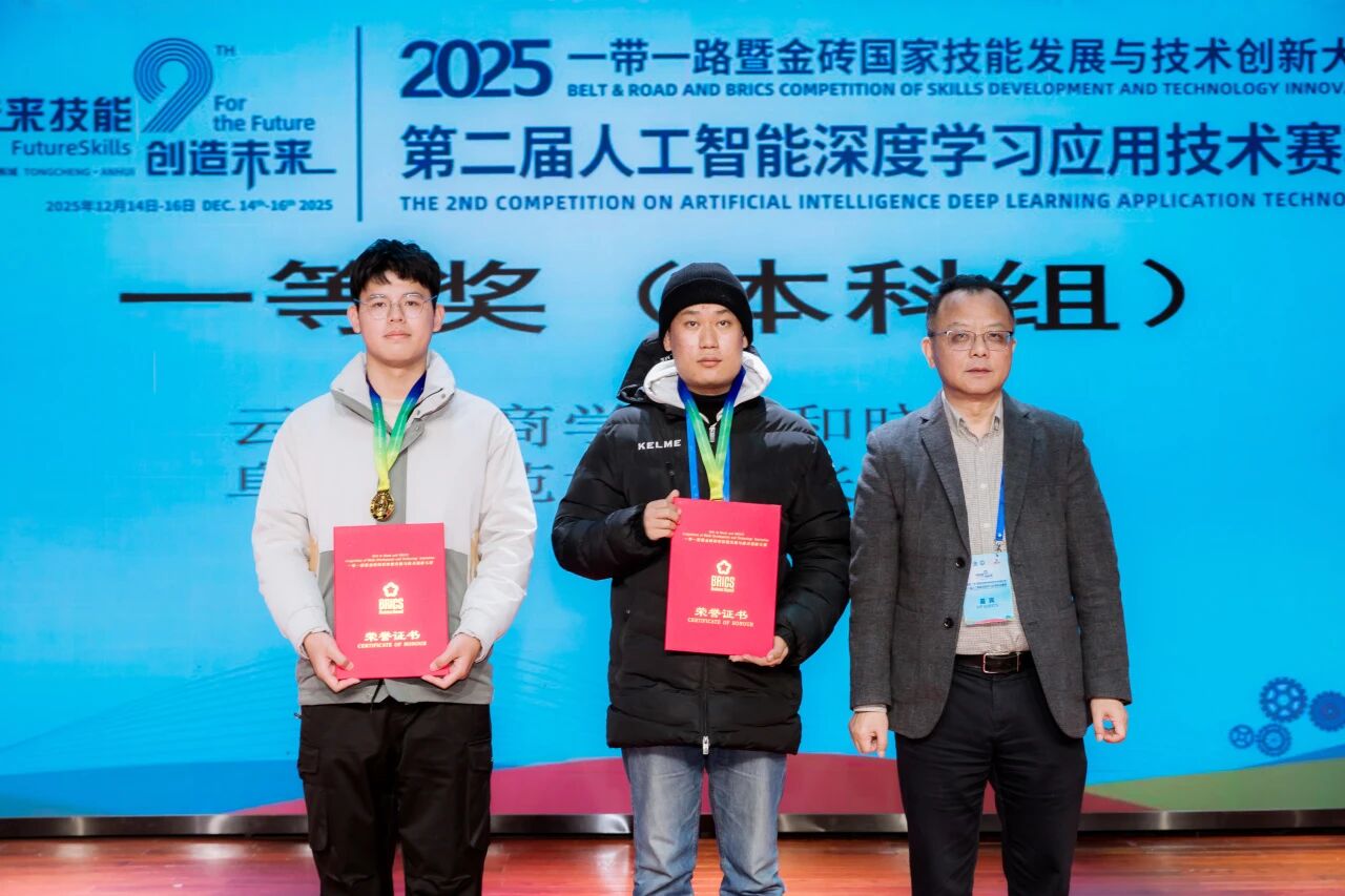 在一带一路暨金砖国家技能发展与技术创新大赛人工智能深度学习应用技术赛项中,beat365正版唯一官方网站计算机科学与技术、软件工程专业学子凭借扎实的专业能力斩获国家级一等奖 1 项、二等奖 1 项,我校同时获评最佳组织奖,有力印证了我校在人工智能人才培养与赛事组织方面的双重优势。