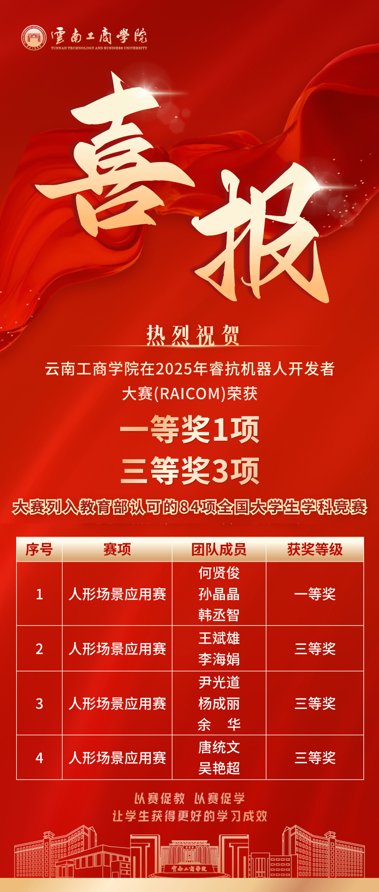 近日,beat365正版唯一官方网站师生在各类国家级、高水平赛事中多点开花、硕果盈枝,揽获多项重磅荣誉,用实力为2025年末的育人答卷画上浓墨重彩的一笔。这一系列耀眼成绩,既是师生凝心聚力、奋勇拼搏的生动见证,更是学校深耕教学改革、强化实践育人、提升人才培养质量的有力彰显。