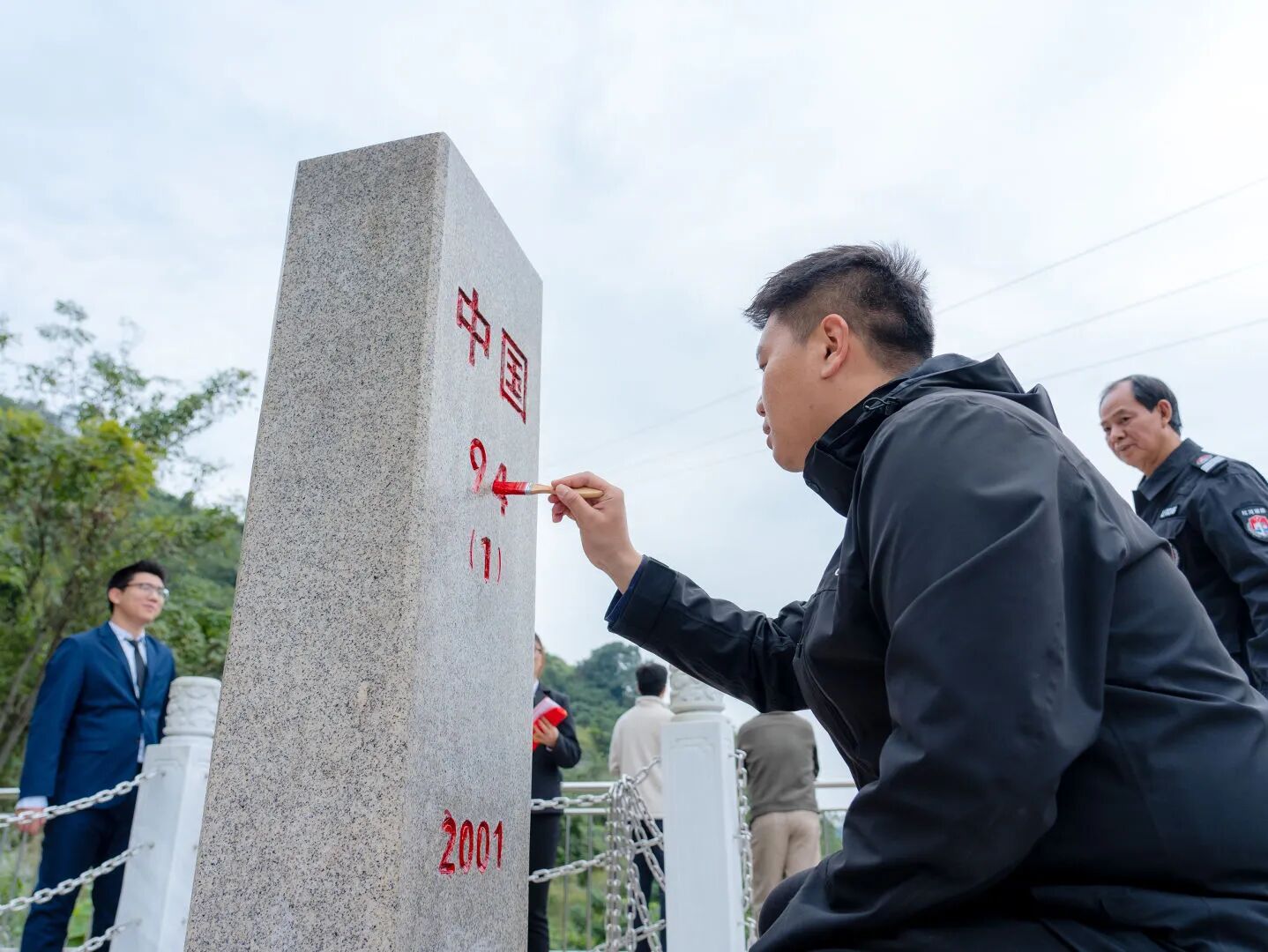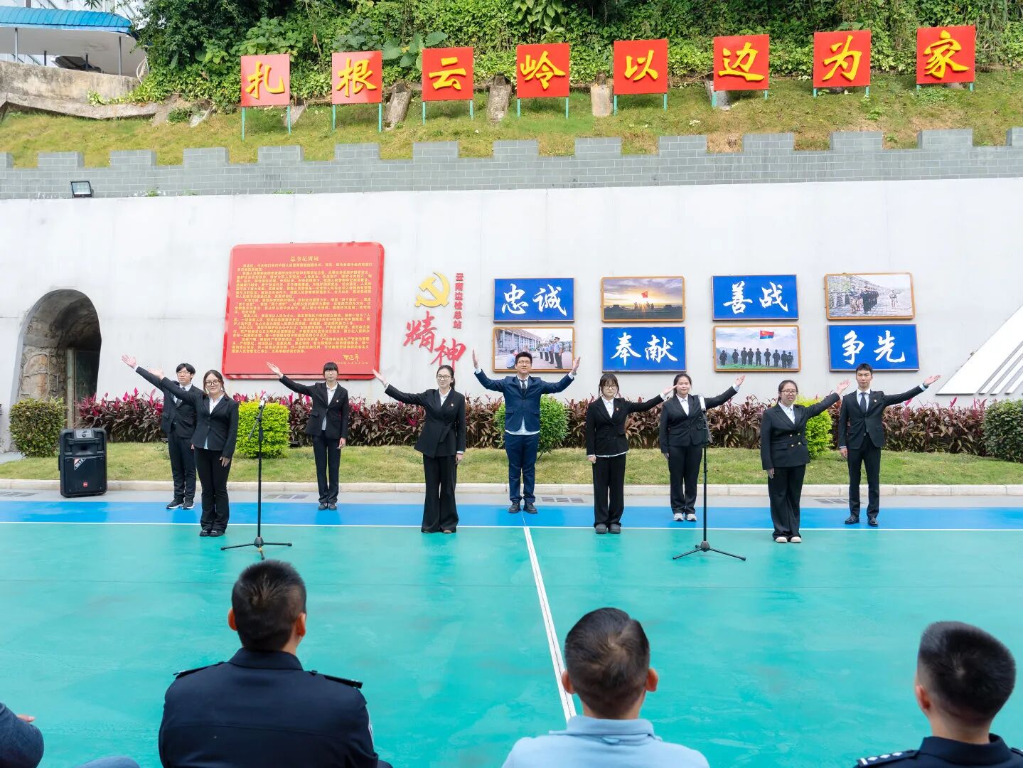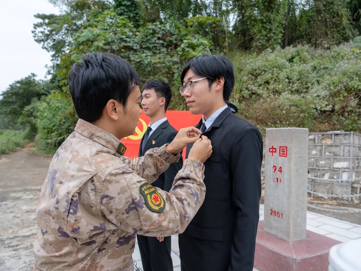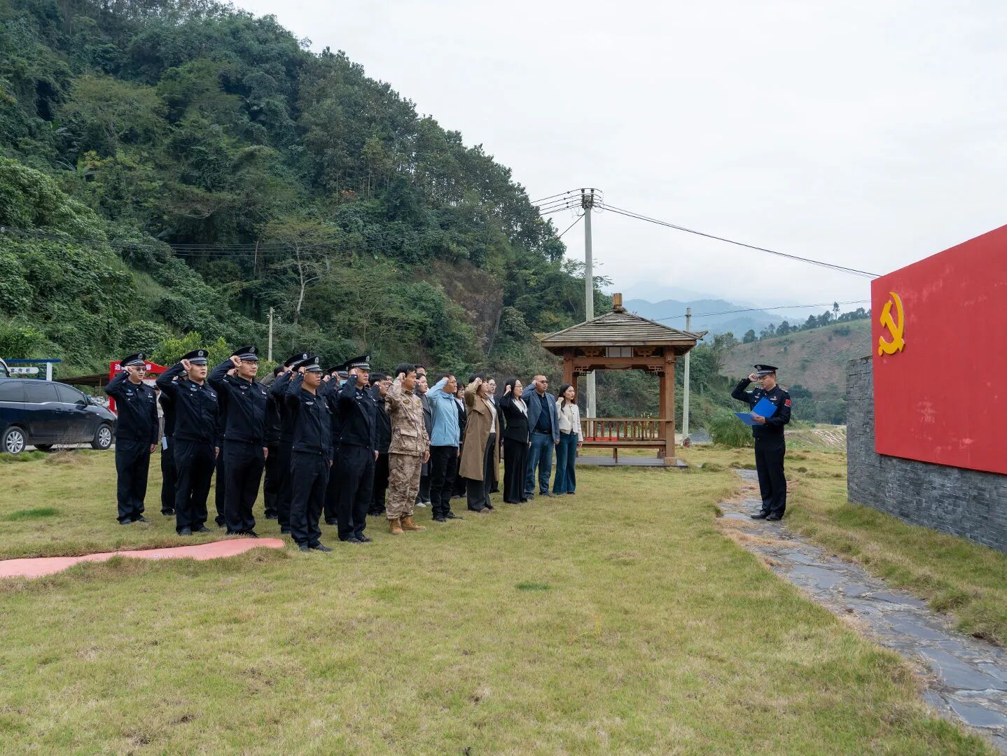 此行最庄重的时刻,定格在大湾联防所的界碑前。全体党员面向鲜红党旗,举起右拳重温入党誓词,铿锵誓言穿透山谷、激荡人心。
