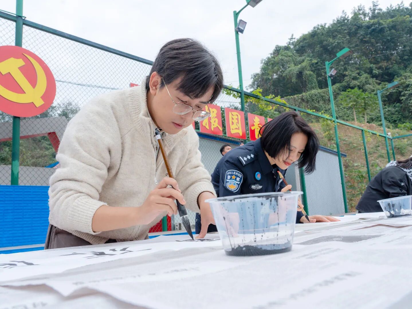 深切感动之余,学校书法教师与特长学生同民警携手挥毫,“忠诚铸盾”、“青春戍边”、“警地同心”、“国门无恙”等作品跃然纸上。墨香氤氲间,警民同心的情谊愈发浓厚,共担使命的共识愈发坚定。