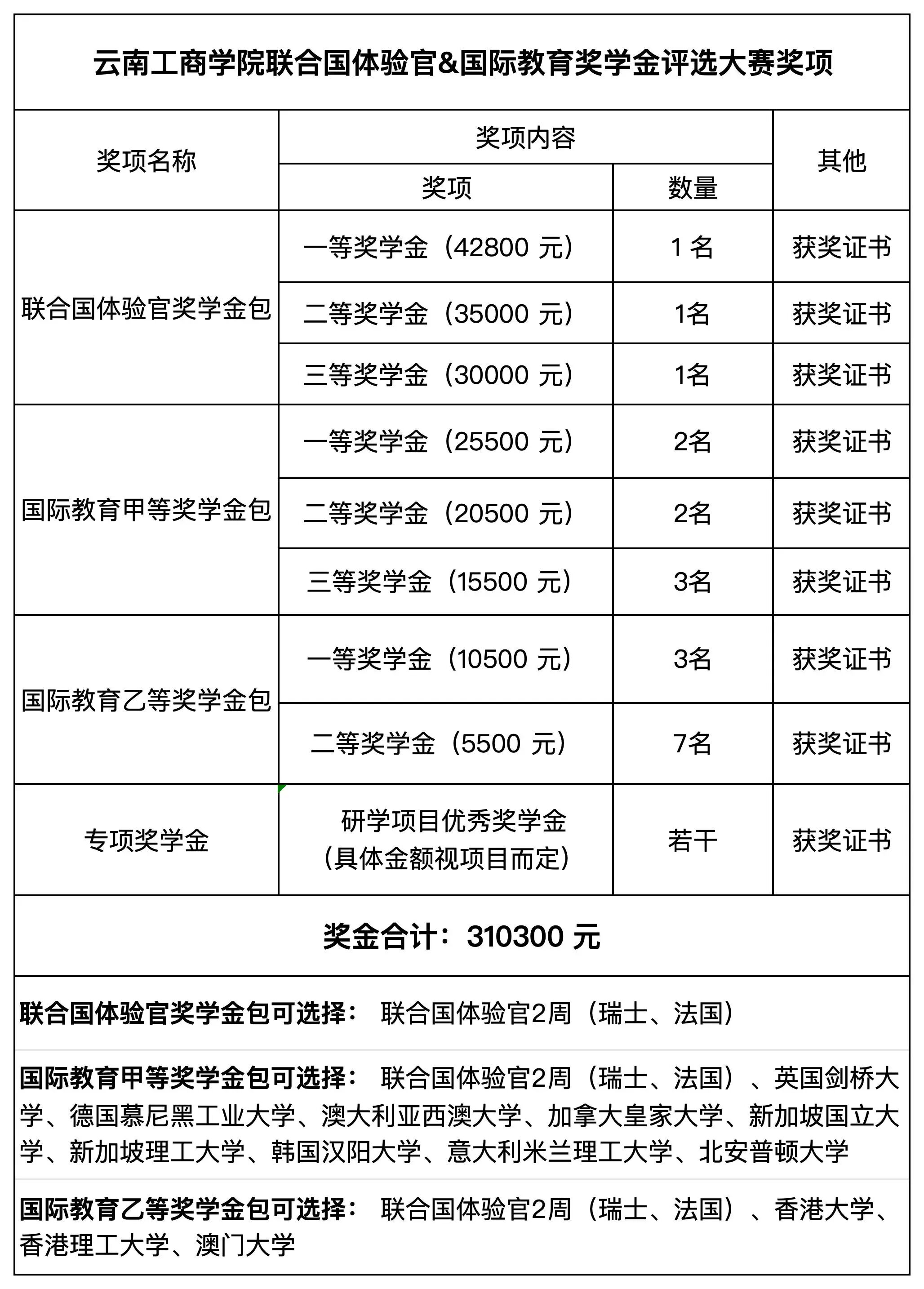 温馨提示 1.所有奖学金仅可用于抵扣上述项目; 2.本项目采取“奖学金等级与研学项目对等匹配,向上兼容、向下禁止”的规则:获得联合国体验官奖学金包的学生,仅限选择联合国体验官项目;获得国际教育甲等奖学金包的学生,可选择联合国体验官或国际教育甲等项目,若选择联合国体验官项目,需补足差额;获得国际教育乙等奖学金包的学生,可选择联合国体验官、国际教育甲等或国际教育乙等项目,若选择更高等级项目,需补足相应差额;专项奖学金可选择上述所有项目,需补足相应差额; 3.所有参加上述项目的同学均可按照出国境交流学习管理办法申请学分置换等; 4.各学校研学项目具体课程安排见附件《2026暑假联合国体验官&国际教育奖学金项目汇总》; 5.获奖学生如有特殊情况无法参与项目,奖学金可赠予他人使用,受让人必须是本校学生,且需要通过资格审核;逾期未缴纳费用视为自动放弃获奖资格,空缺名额按决赛排名依次递补; 6.不想参与比赛或参与比赛没获奖的学生,若想参与项目请咨询国际项目负责老师。