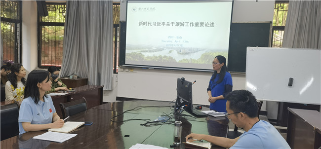 院长郭剑英作了题为《习近平关于新时代旅游工作重要论述》的学习报告。郭剑英介绍了五个方面的内容:中国共产党关于旅游工作重要论述的发展阶段、促进旅游产业高质量发展的主要观点、旅游工作重要论述的理论基础、旅游工作重要论述的主要特征、未来旅游业发展的主要方向。郭剑英要求全院教师认真学习习近平总书记关于新时代旅游工作的重要论述精神,并在教学科研、服务地方等工作中认真贯彻落实。