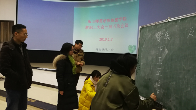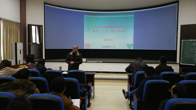2019年1月7日上午,旅游学院全体教职工在3D实验室隆重召开第一届五次教代会暨工会代表大会,工会主席谢艳主持会议。旅游学院分工会应到35人,实到31人,按照选举法表决有效。