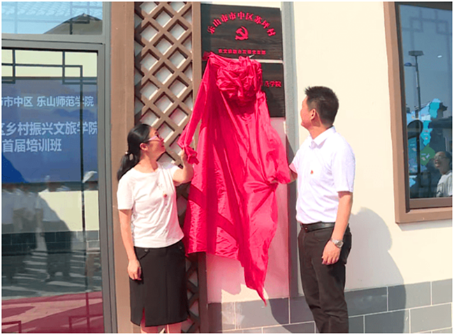 本网讯(文/薛文娟 图/门涛)为全面落实“十四五”时期关于乡村振兴战略的重要部署和总体要求,深入挖掘乡村文化和旅游资源,加快培育具有区域影响力的标杆性精品乡村旅游品牌,乐山师范学院与乐山市市中区深入开展校地合作,成立市中区乡村振兴文旅学院,地点设在牟子镇苏坪村古儿坝。7月8日,乡村振兴文旅学院揭牌仪式在古儿坝举行。市中区区委副书记向珂、区委常委杨鹄、区委常委陈洪波、pg娱乐电子游戏官网入口院长郭剑英、经济管理学院党委书记郭晓黎及美术与设计学院副院长门涛参加揭牌仪式。