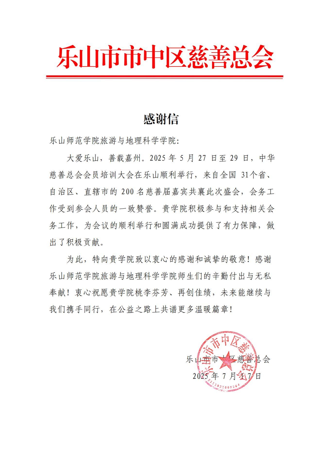 本网讯(文、图/郑曾俊)近日,乐山市市中区慈善总会专程向pg娱乐电子游戏官网入口致送感谢信,感谢pg娱乐师生在今年5月27日至29日中华慈善总会会员培训大会中的贡献。