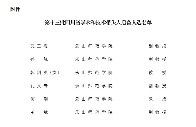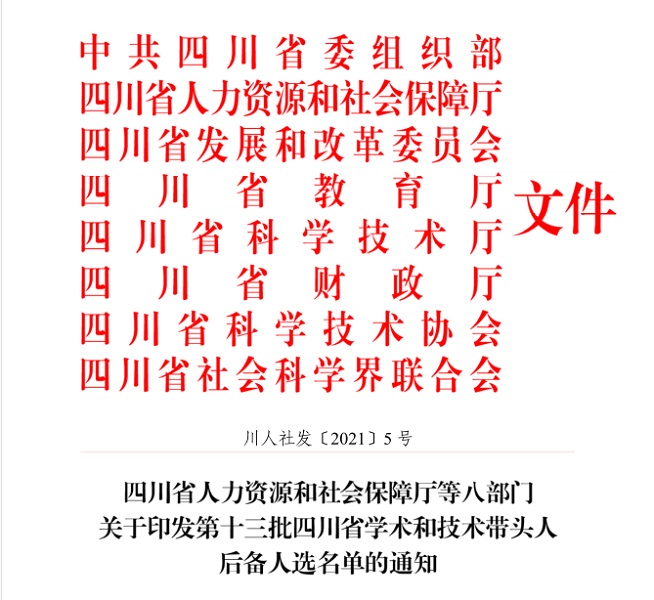 根据四川省人力资源和社会保障厅等八部门《关于印发第十三批四川省学术和技术带头人后备人选名单的通知》(川人社发[2021]5号)文件,经各部门推荐,同行专家评议,省委组织部、省发改委、省教育厅、省科技厅、省财政厅、省人社厅、省科协、省社科联等部门研究,全省1144名同志被批准为第十三批四川省学术和技术带头人后备人选。其中,pg娱乐院长郭剑英入选,荣获四川省第十三批学术和技术带头人后备人选称号。