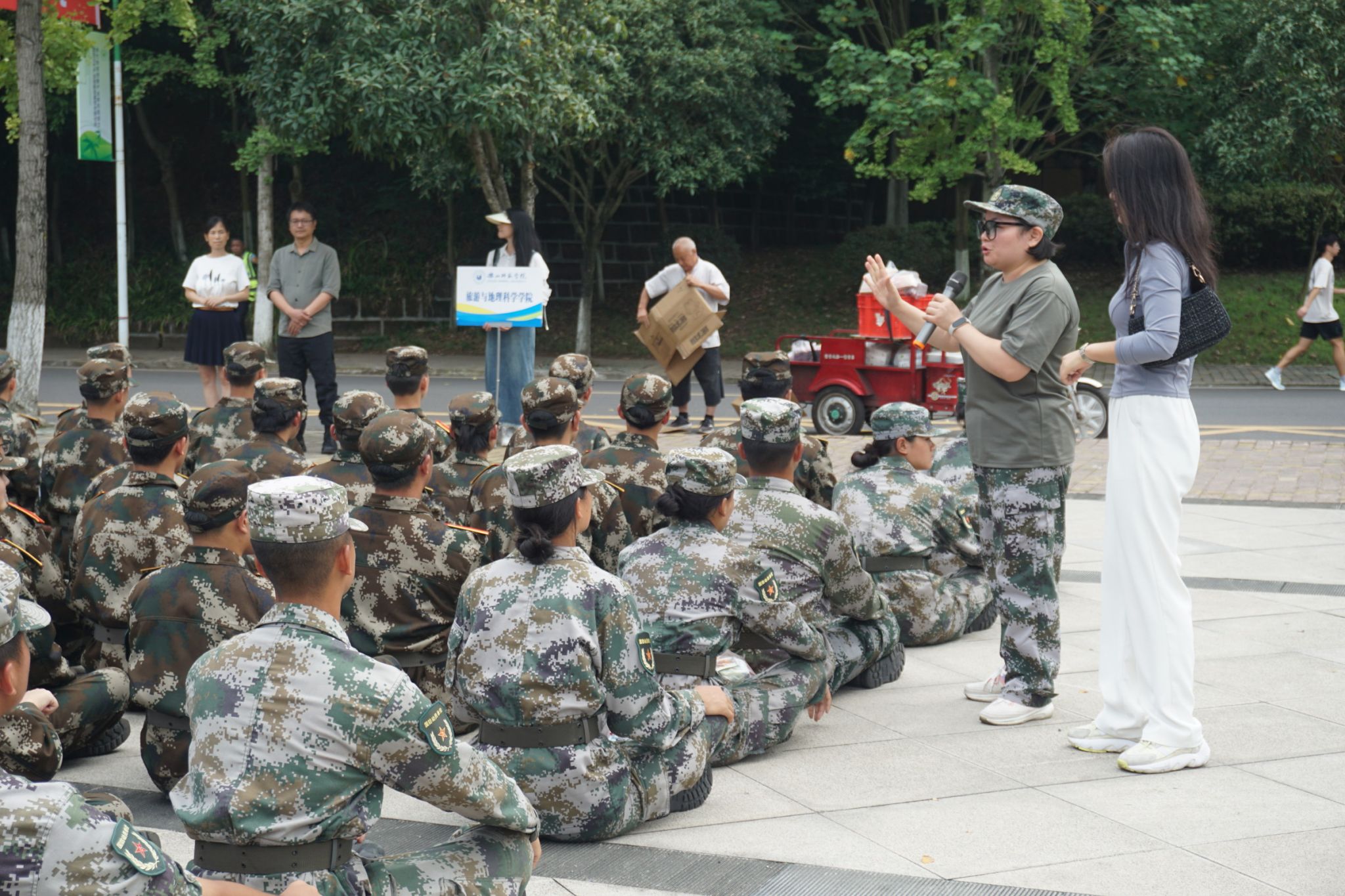 本网讯(文、图/张雯)9月21日,pg娱乐电子游戏官网入口在北操场组织慰问了军训新生。学院党委书记徐秀云,党委副书记、纪委书记冉勇,2023级新生辅导员江纳,2023级新生班主任段捷,辅导员郑曾俊以及部分学生代表参与慰问。