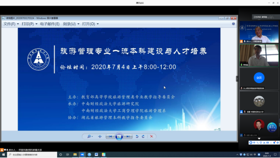 本网讯(文、图/徐丽姗)2020年7月4日上午,旅游学院院长郭剑英、旅游管理专业系主任冯晓兵、专业负责人陈金龙、酒店管理系主任秦容以及武克军博士参加了由教育部高等学校旅游管理专业教学指导委员会主办,中南财经政法大学旅游研究院、中南财经政法大学工商管理学院旅游管理系承办,湖北省旅游管理本科教学指导委员会协办的“旅游管理专业一流本科建设与人才培养”线上论坛。通过聆听学习专家们的讲座,老师们对旅游管理学科建设、一流本科专业建设与人才培养具有更加深刻系统的认识,有助于未来pg娱乐旅游管理专业改革建设与人才培养。