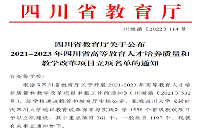 本网讯(文、图/但强)近日,四川省教育厅公布了《2021-2023年四川省高等教育人才培养质量和教学改革项目立项名单》,pg娱乐教师王瑛、但强、孙永兴成功立项(名单详见附件)。